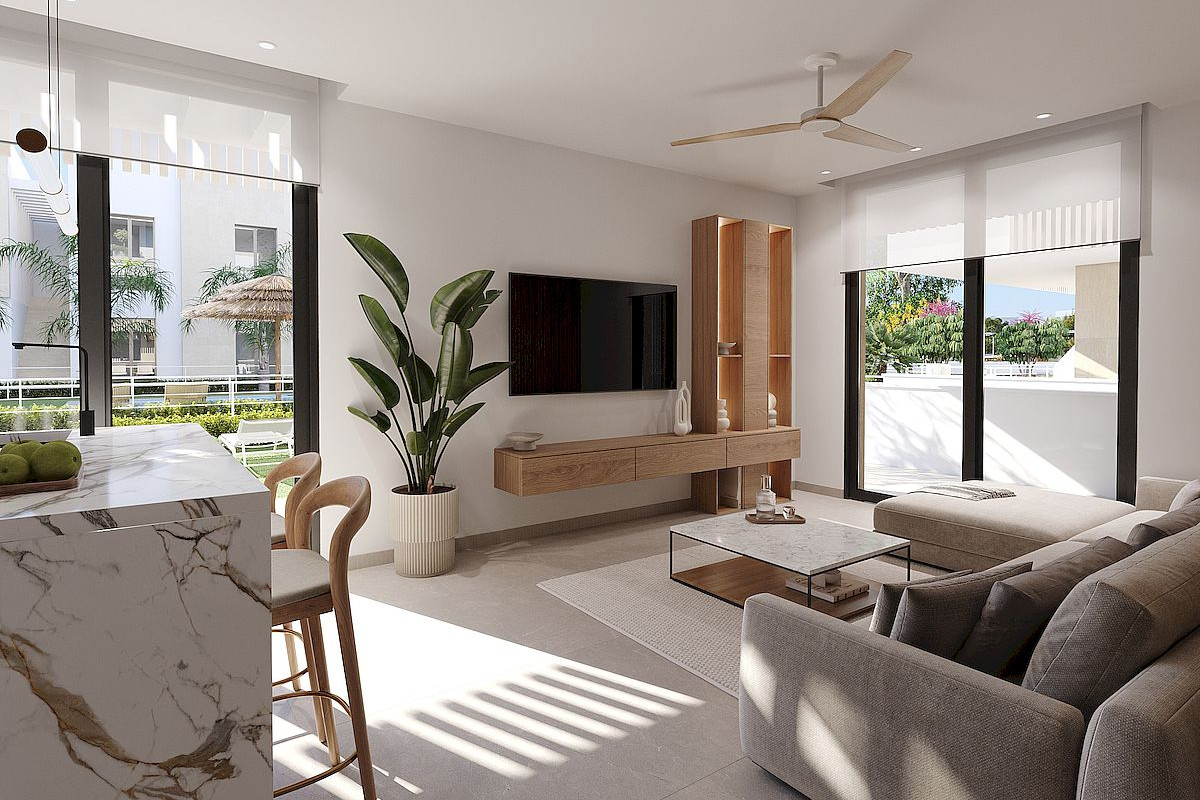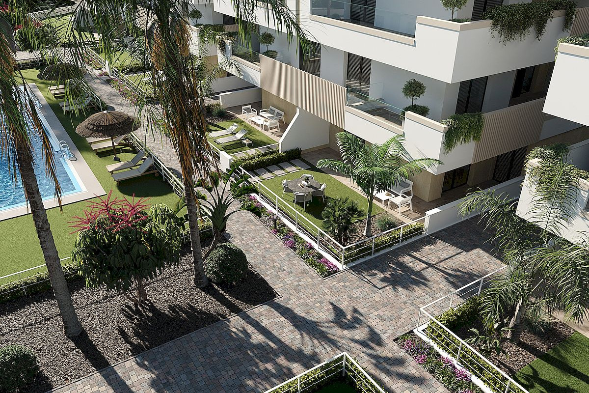 There are five blocks of eight apartments per block, providing properties with 2 communal pools, parking and storage room. The apartments are distributed between ground floor with garden, first and second floor with terrace and third floor with private solarium, with two properties on each floor and a lift to move from one to other level.
