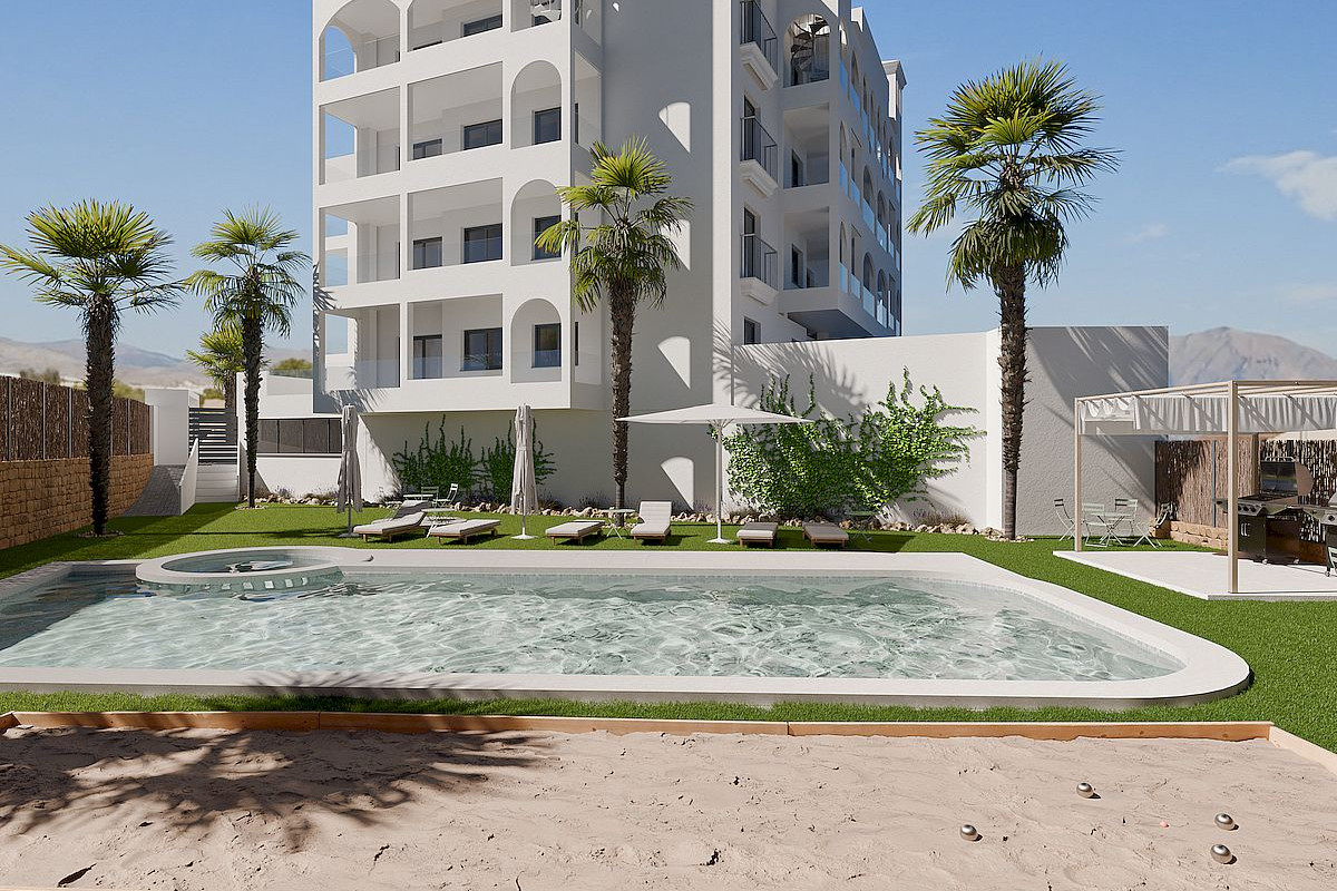 Кожен апартамент має паркувальне місце у підземному гаражі, а деякі — ще й комору, що забезпечує додатковий комфорт і безпеку для мешканців. У центрі комплексу розташований прекрасний спільний басейн — чудове місце для релаксу в теплі дні провінції Аліканте.
