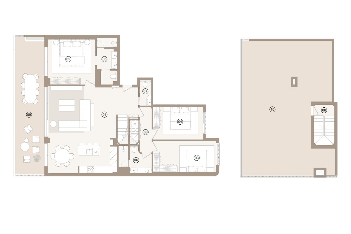 Апартаменти включають 3 спальні, просторі тераси з відкритими видами та/або приватний сад, а також розкішні пентхауси з панорамним видом на море та унікальними особливостями. Ексклюзивні апартаменти з 3 спальнями — ідеальне місце для відпочинку, де комфорт і дизайн поєднуються з чарівністю середземноморського способу життя. Кожен апартамент має дві ванні кімнати (одна з них у головній спальні).