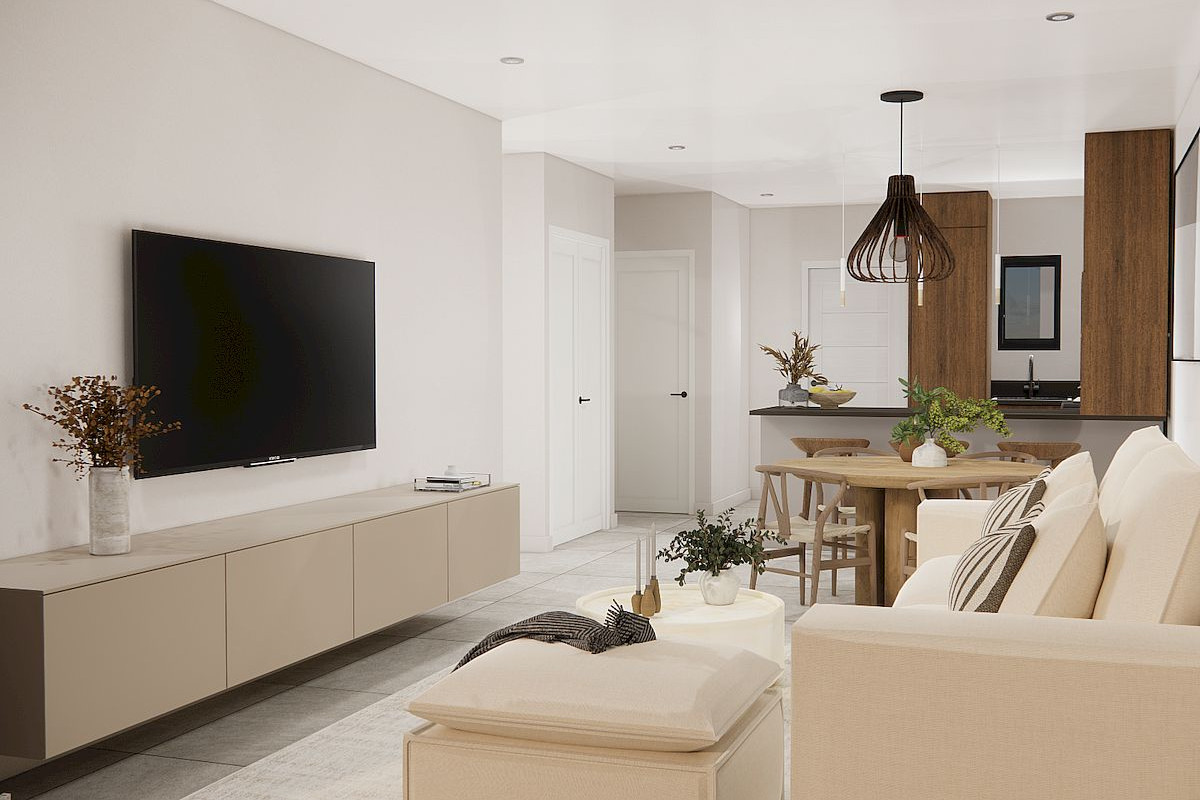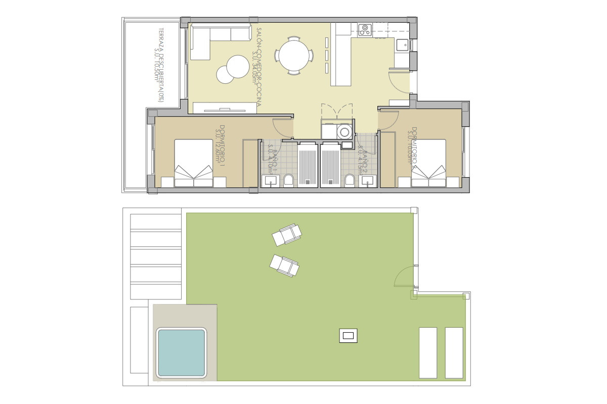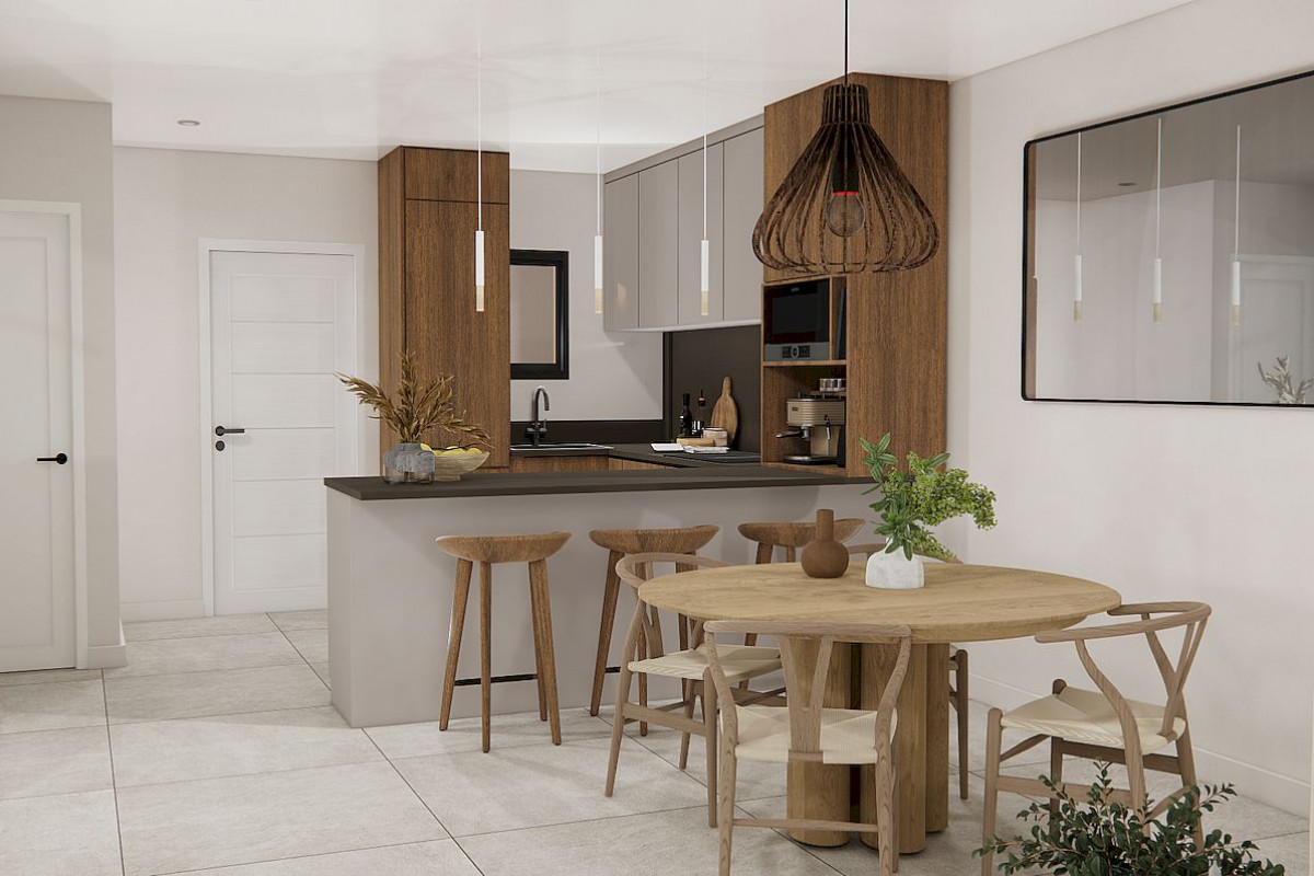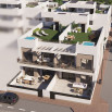 Комплекс пропонує сучасні мезонети з 2 спальнями та 2 ванними кімнатами, включаючи головну спальню з власною ванною. Покупці можуть обирати між квартирами на першому поверсі з просторими приватними терасами, ідеальними для відпочинку на відкритому повітрі, або апартаментами на верхньому поверсі з терасою та приватним солярієм, ідеальним для засмаги та релаксу. Деякі апартаменти на верхньому поверсі доступні за допомогою ліфта, що додає зручності та комфортного доступу.
