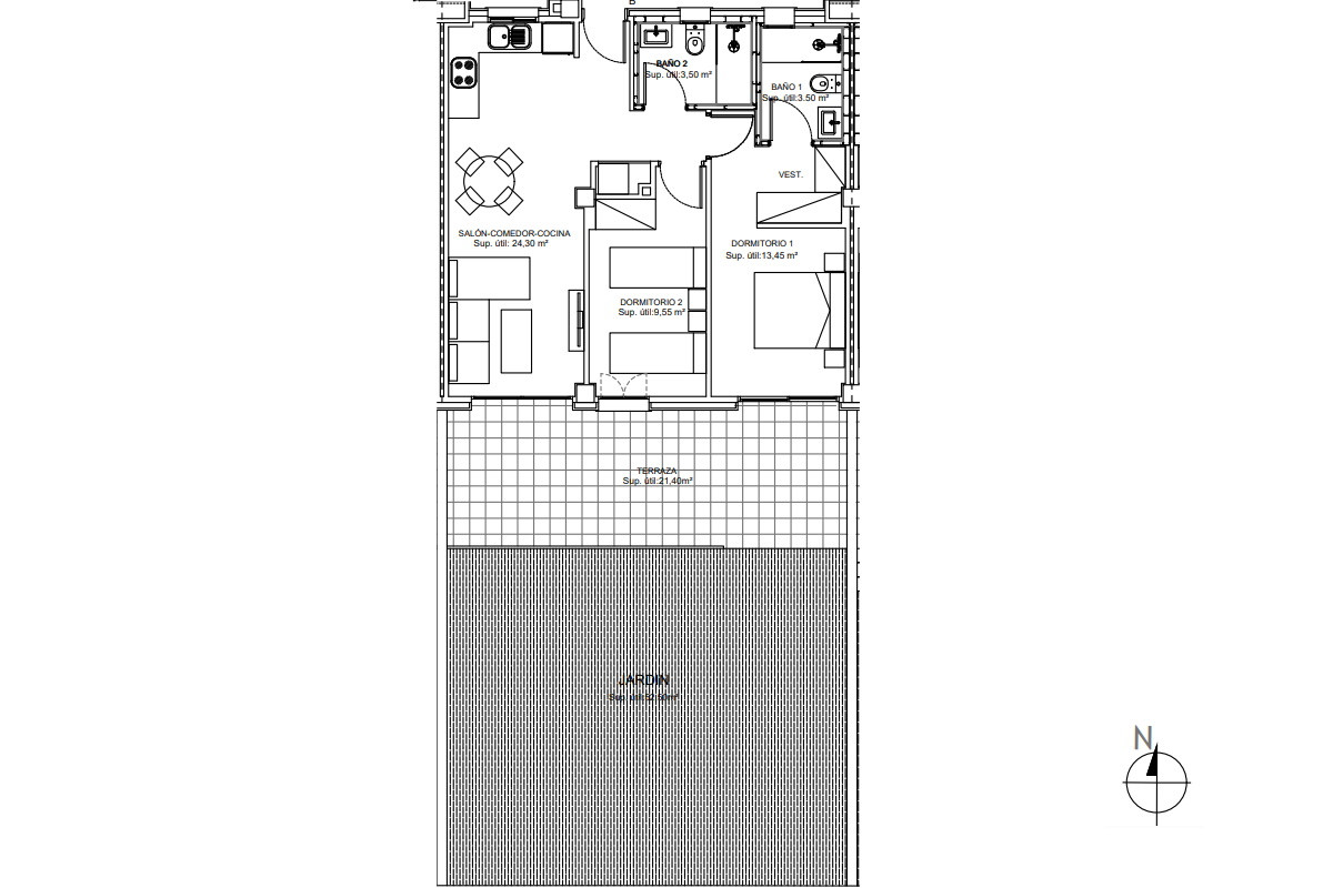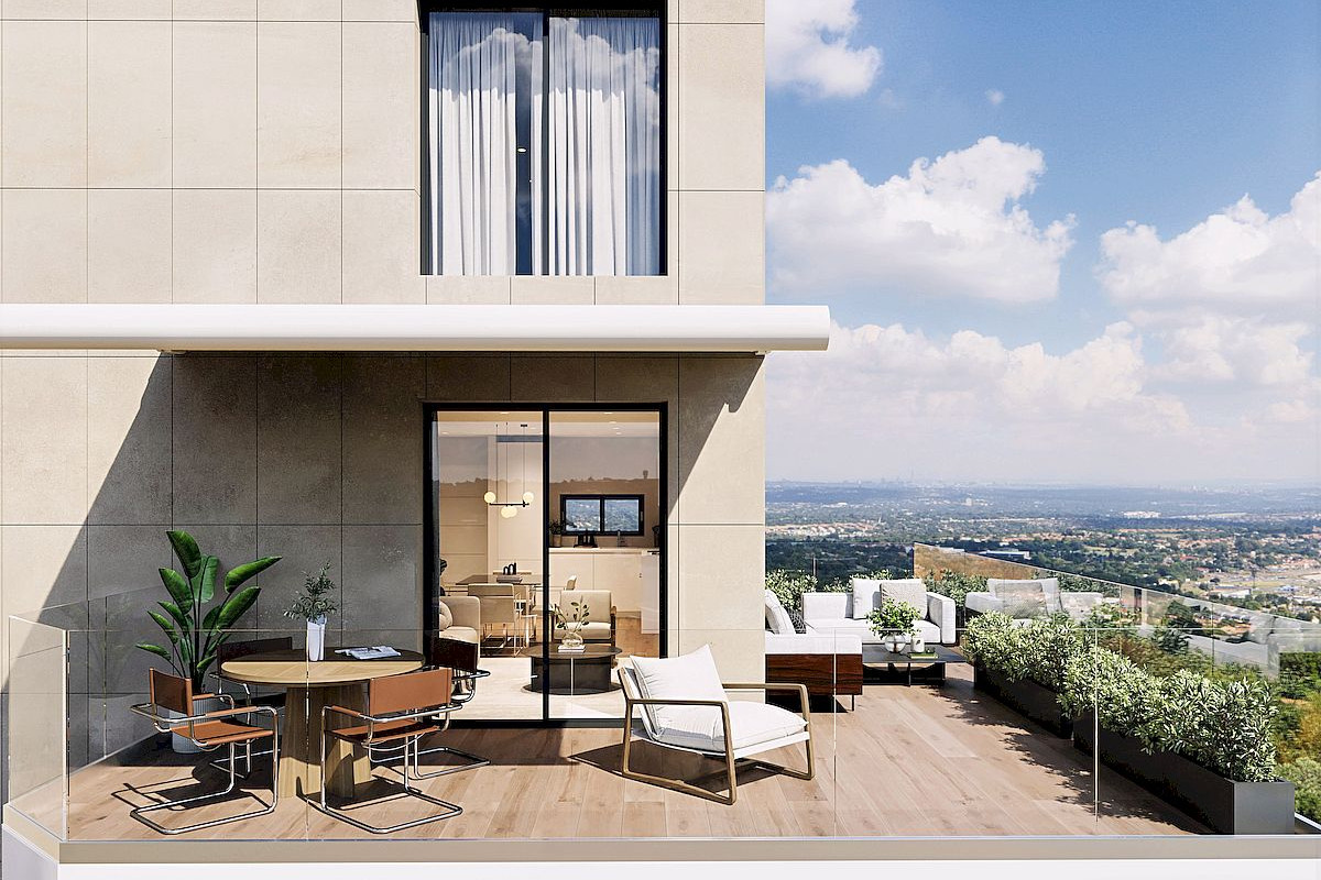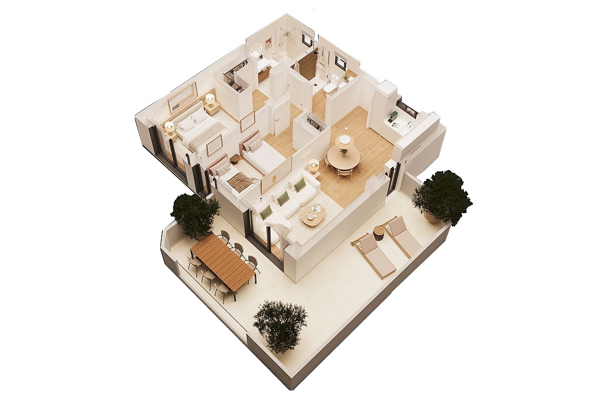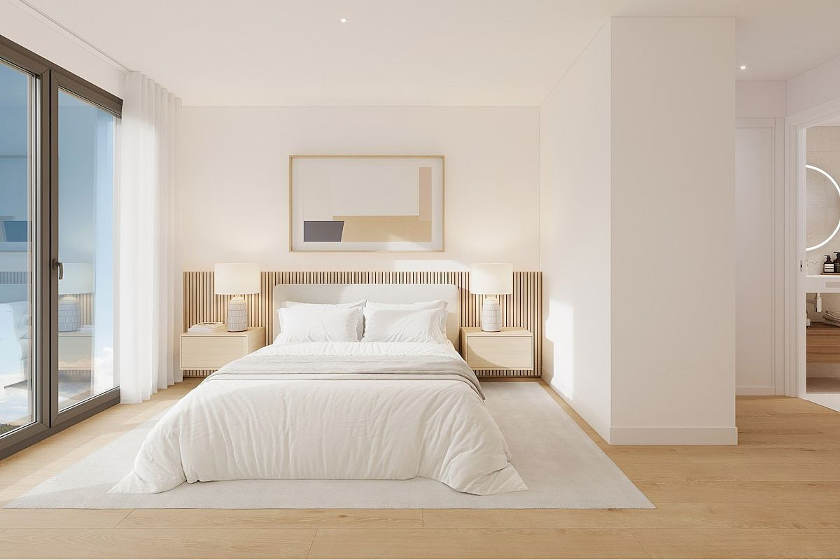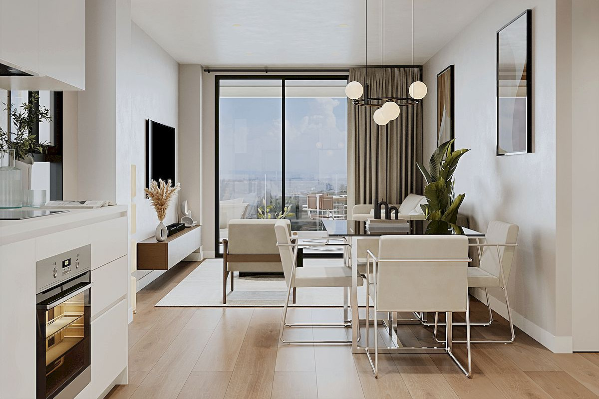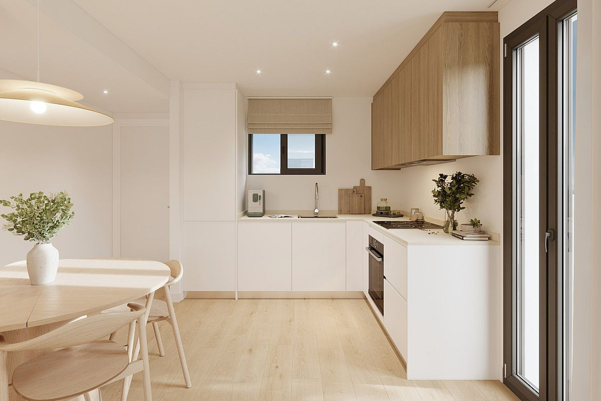 Апартаменти пропонують одну, дві або три просторі спальні та одну або дві ванні кімнати, а також великі тераси. Житлова зона світла та виконана у відкритому плануванні, з великими вікнами, що забезпечують плавний перехід на терасу. Відкрита кухня повністю оснащена висококласною технікою Bosch або Siemens та оздоблена преміальними матеріалами Porcelanosa. Кожна деталь відображає довговічність і вишуканість.