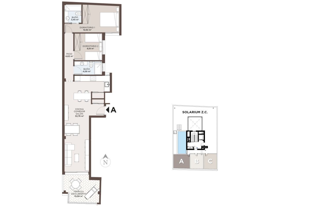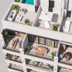 The building consists of 15 apartments, a spacious studio on the ground floor and 14 two-bedroom, two-bathroom apartments, designed to maximize natural light and comfort. All the apartments are spacious and bright, with rooms that facilitate comfort and enjoyment of the home. The ground floor properties have terraces and private patios, while the other apartments have large south-facing terraces, ideal for making the most of natural light and the Mediterranean sun. The penthouses stand out for their private solariums, offering an exclusive and private space to enjoy the outdoors and the good weather all year round.