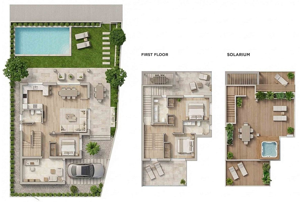 Кожна вілла має три просторі спальні та три сучасні ванні кімнати, спроєктовані для максимального щоденного комфорту. Особливою перевагою є зовнішні простори: приватний басейн, власне паркомісце та велике соляріум, ідеальне для відпочинку під середземноморським сонцем.